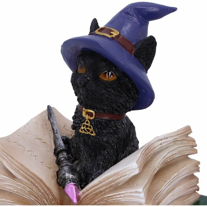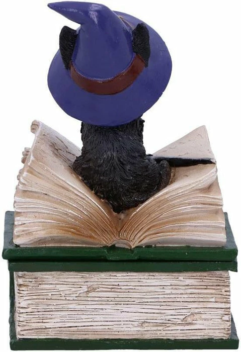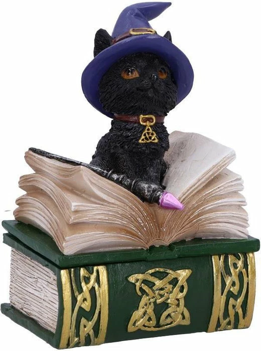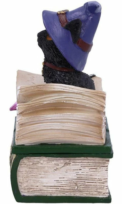 This charming cat figurine is cast in high-quality resin before being painstakingly hand-painted. Binx is feeling playful while sitting inside the pages of an emerald spell book. With a purple Witches hat on his head, he can be lifted to reveal a spacious storage box compartment below, the perfect gift for the charming witch in your life.