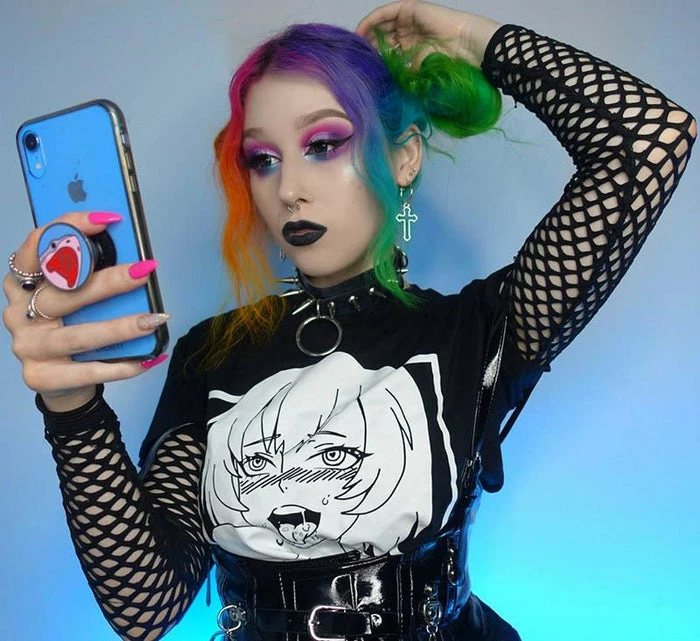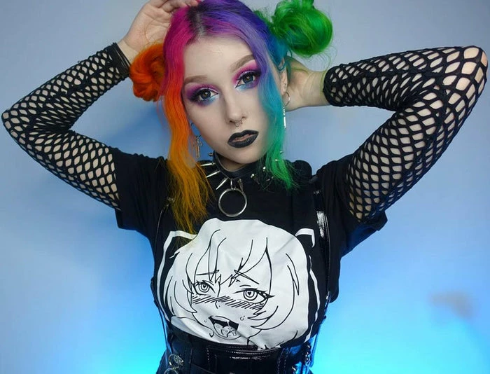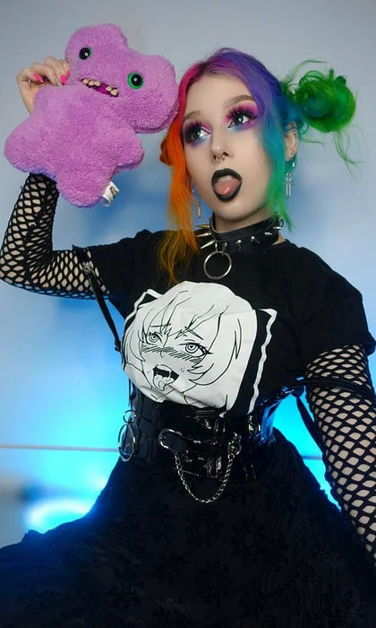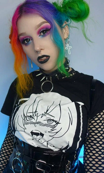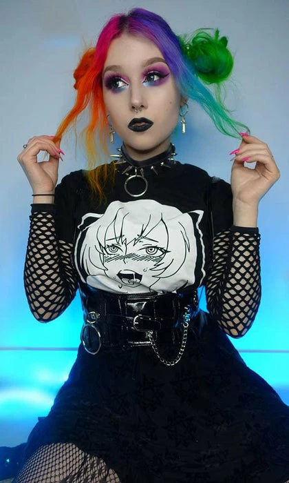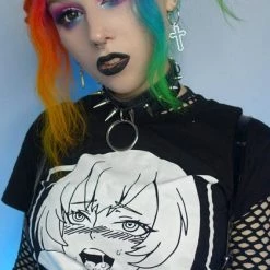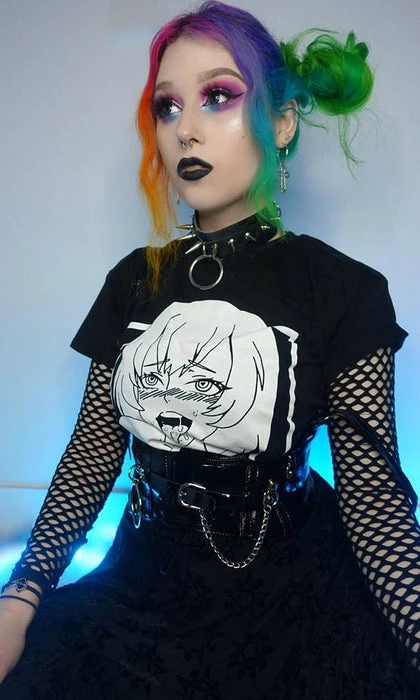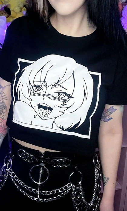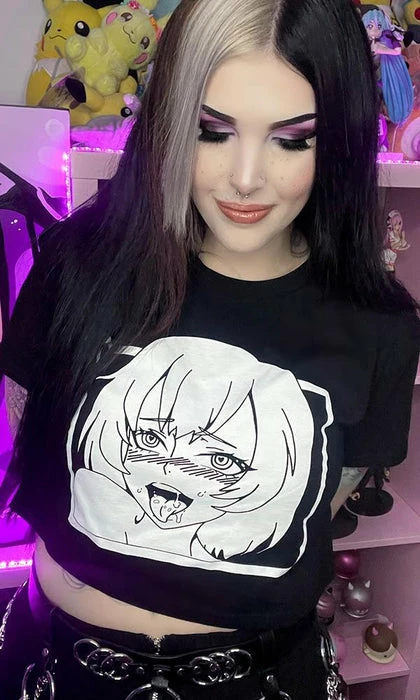 Channel your inner anime persona in the cheeky Ahegao cropped tee! Pair with a pleated skirt and fishnets for a super cute E-Girl vibe.Â
