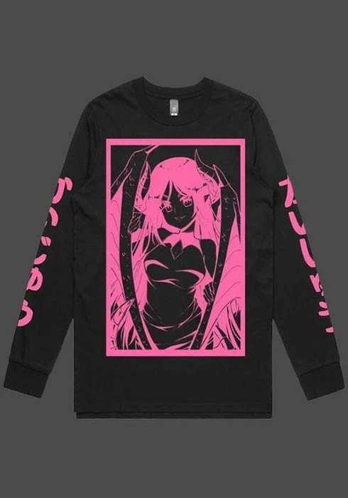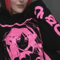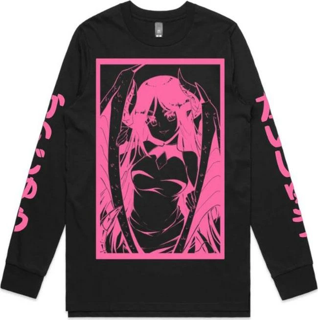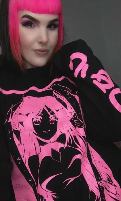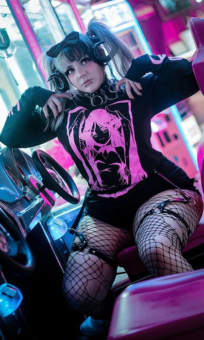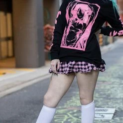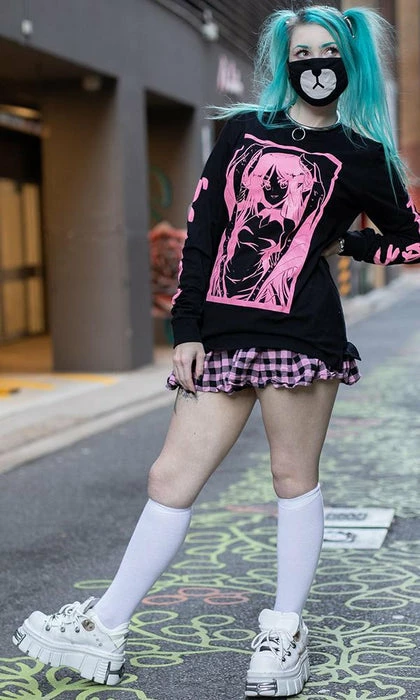 This super cute long sleeved tee features a hot pink manga style Kaiju design on the fron and text down the sleeves! Looks amazing paired with a tights and large statement platforms!