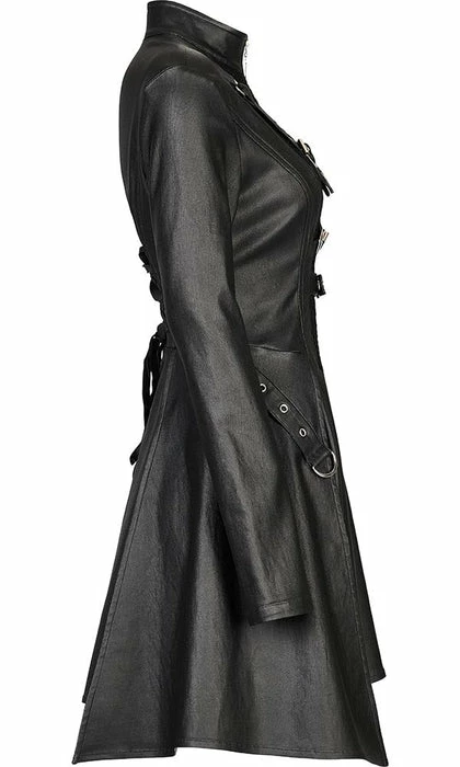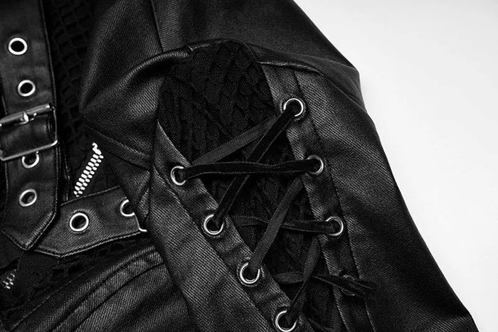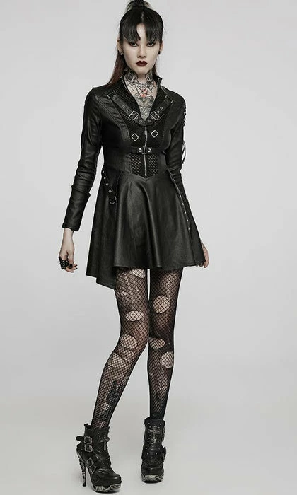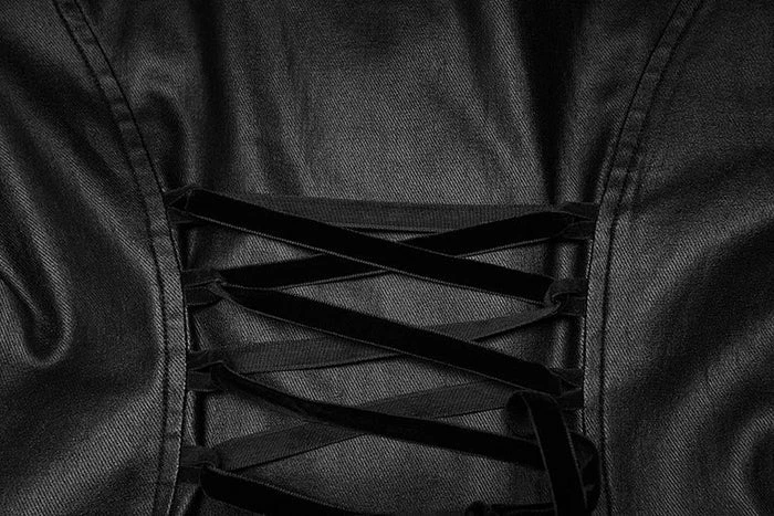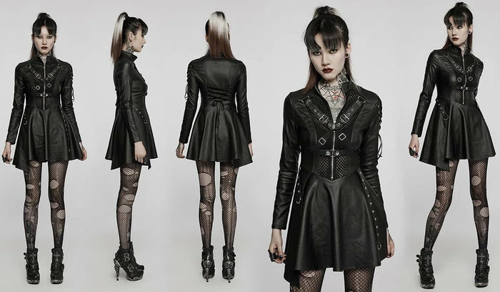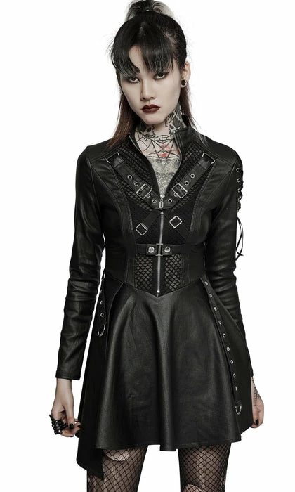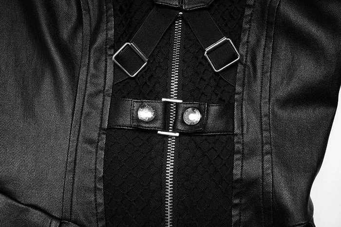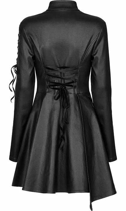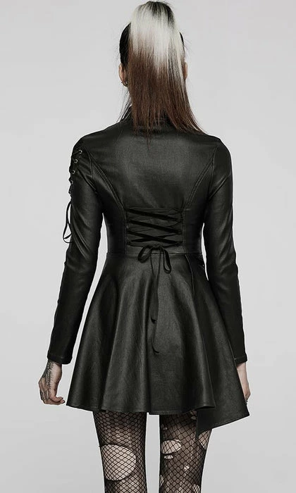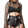 Look good, feel even better in the Sovereign dress! This Black elastic faux leather is so sexy and will make you feel like royalty! Featuring mesh panels with harness straps and corset detailing on the shoulder and back as well as an asymmetric hem line on this dress! You’ll be sure to turn heads when paired with some tights and heels! Â