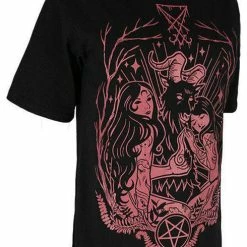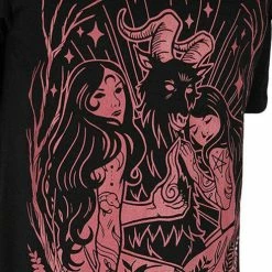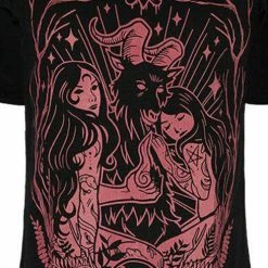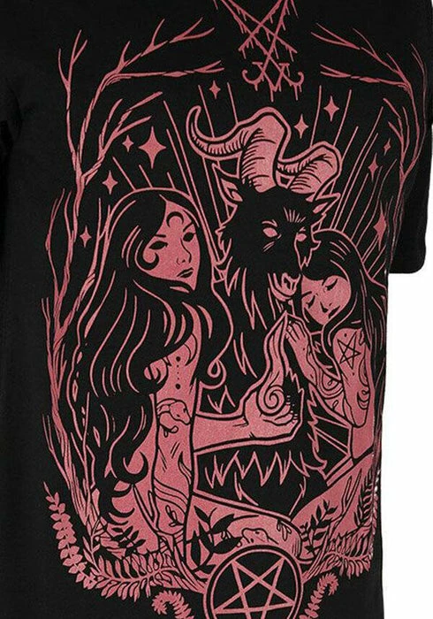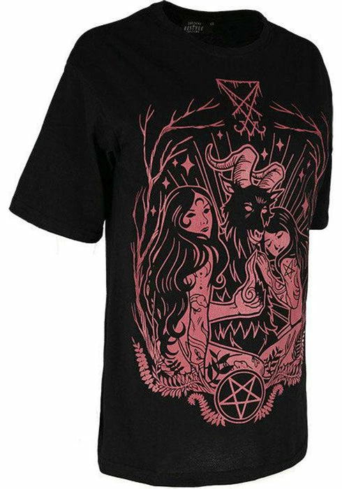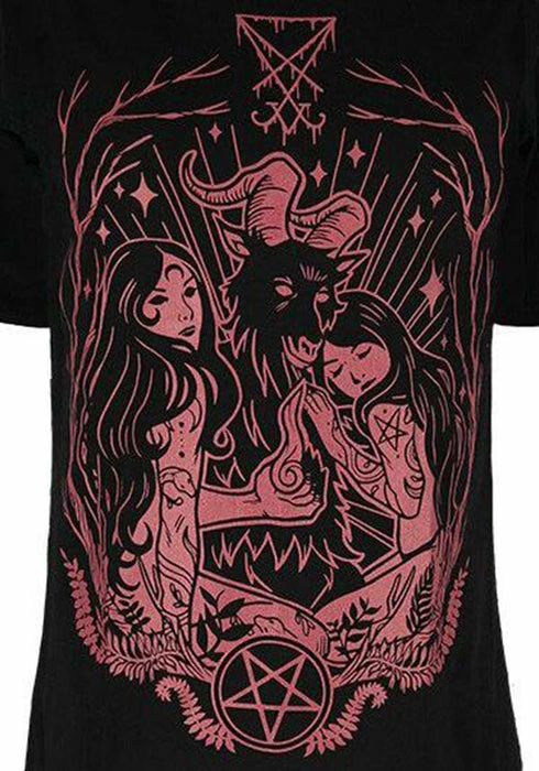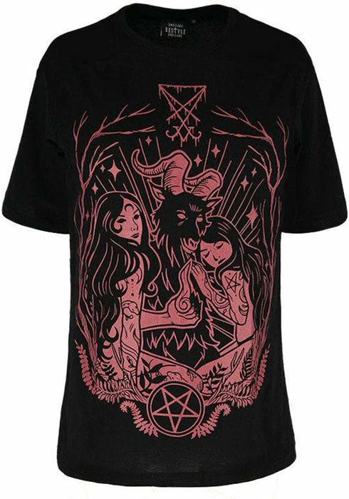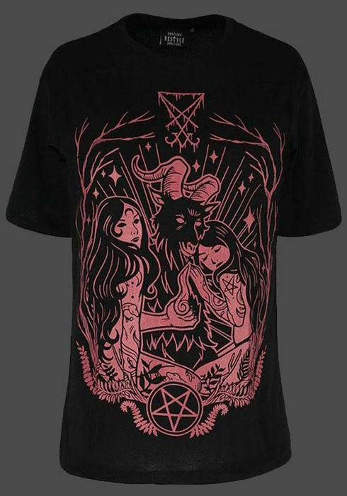 Show your devotion! This black T-Shirt features a Burgundy outlined design of Baphomet with two beautiful tattooed worshippers.