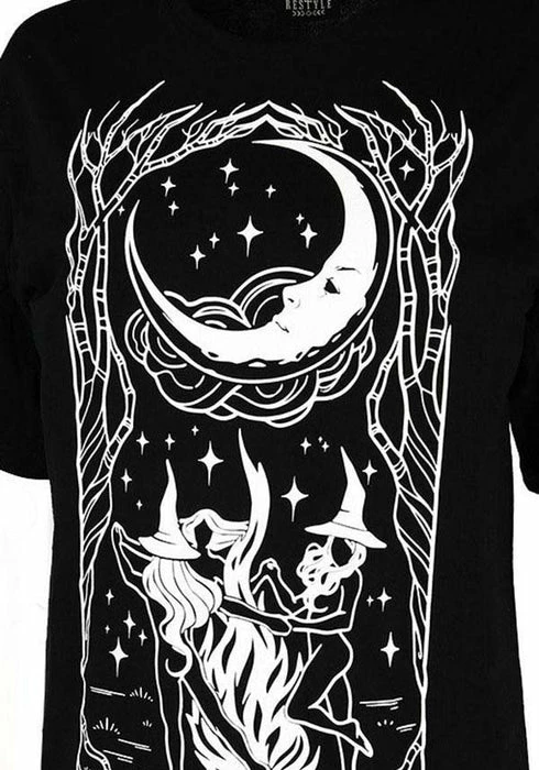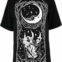 Unisex oversized t-shirt with white printing of a moon above and frame made of branches and a witchy sabbath in the middle of the woods. So comfy to wear! (if you like comfort and unique designs)