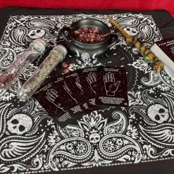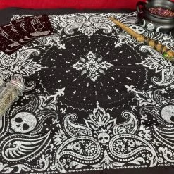 While it is typical of altar cloths to be used specifically to cover a ritual space,ย they can also be used as a bandana or hair accessory. The body is a temple, so why not use them to bring intention to your daily activities. Consider which symbols you want to invoke throughout the day and brandish them with pride.ย