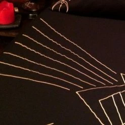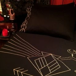 Gold-tone embroidery adorns the pitch black fabric of this duvet cover, covering your bed in ancient designs of the evening sky.