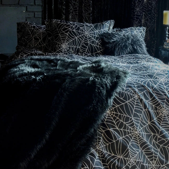 Ensnare your prey with the Spider Web bedding collection. This duvet cover is made of 100% cotton. As soft as spiders silk it features a bone white spider web stretching across jet black fabric.