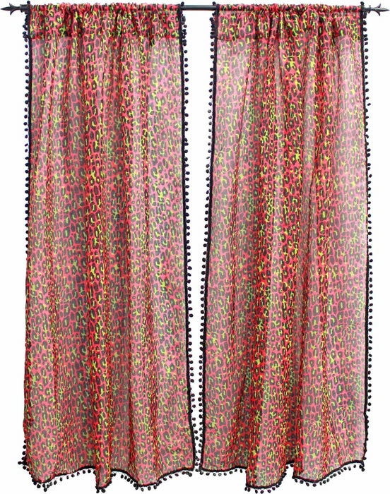 Fall head over heels in love with the Sourpuss pink leopard window curtains! These fun, bright 60s inspired curtains feature our hot pink leopard print artwork and are trimmed with black pom poms. Each set contains two curtain panels that have a tunnel for your curtain rod. Perfect for any room in your lair!