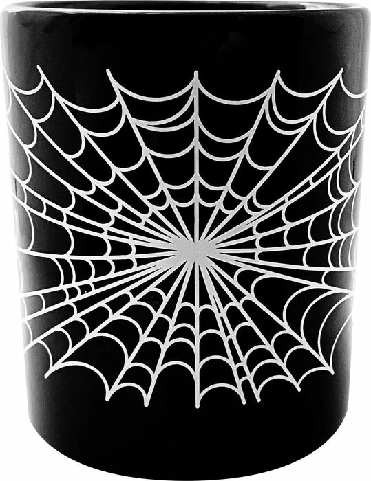 This Spiderweb Mug is perfect for all you early morning ghouls! This black ceramic mug is printed with a eye-popping white spiderweb design.Â