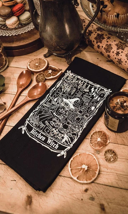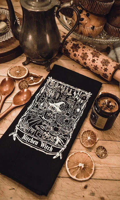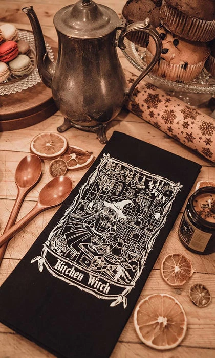 Celebrating all kitchen witches as a witch works in her kitchen surrounded herbs, baked goods, and the magick of her kitchen.