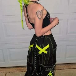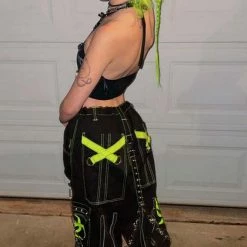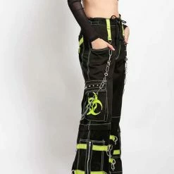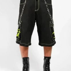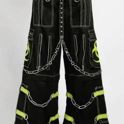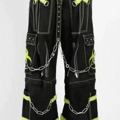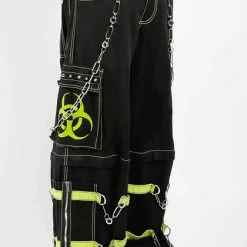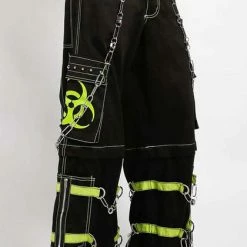 Accept no imitations! From the originator of all things DarkStreet, these black and lime studded pants zip off into shorts and feature a biohazard symbol on each leg, removable chains, adjustable ankles, D-rings, and deep pockets.