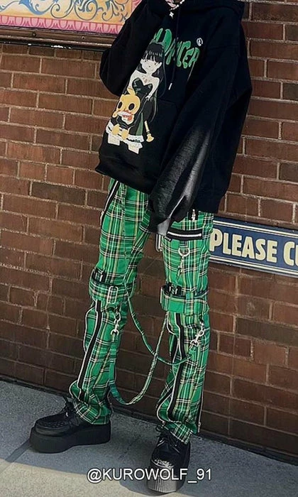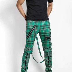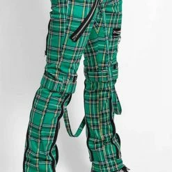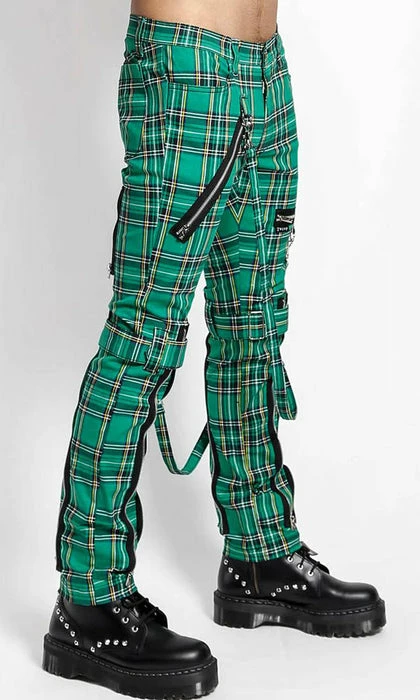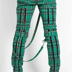 These Green plaid pants were made for rocking out in. These classic pants feature removable bondage straps and zipper details. Pant legs can be zipped for a change in fit, topped off with a zip fly and button closure.