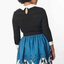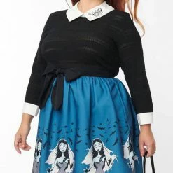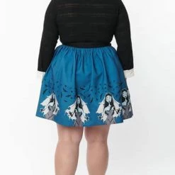 This sweet skirt in collaboration with Corpse Bride, is crafted in a fabulous blue woven that boasts a sweet border print of Emily the Corpse Bride. The black banded waist features attached self ties, while the flare skirt dances above your knees.