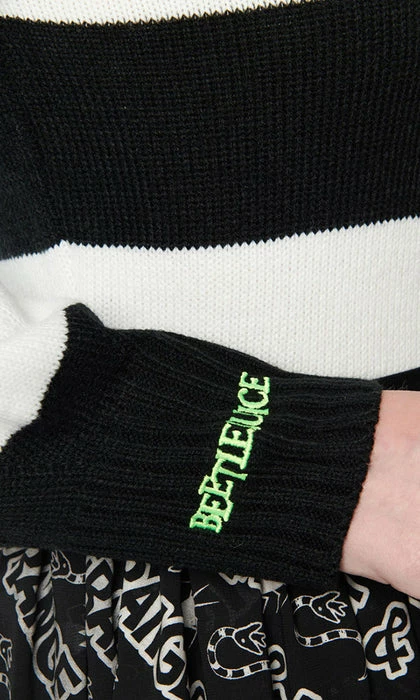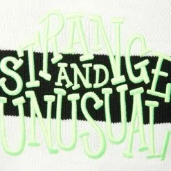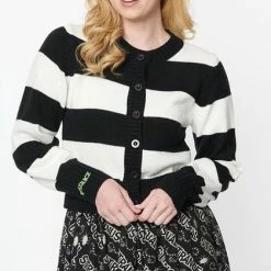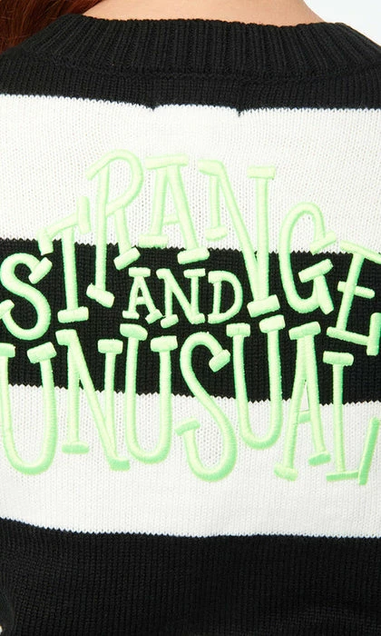 Crafted in a soft sweater knit with black and white stripes. The long sleeve cardigan boasts the words ‘ Strange and Unusual’ embroidered in green on the back.