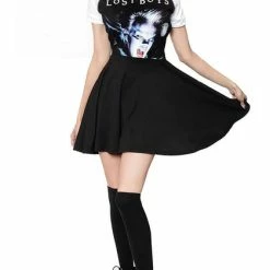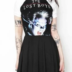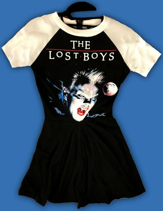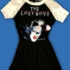 Add a little excitement to your wardrobe with Lost Boys Baby Doll Dress! Made from an altered men’s t-shirt, this professionally sewn super soft dress features short baseball style sleeves, a round neckline and has a Lost Boys print. Pair this dress with some ripped stockings and some stomping boots for a fun goth look.Â